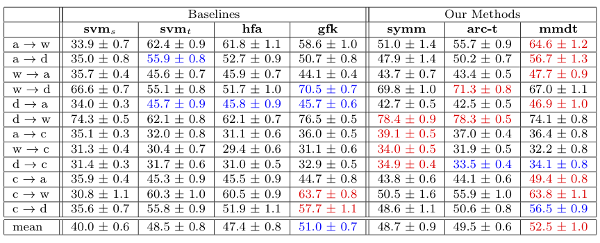 - Baselines: gfk, Gong et al. (2012); hfa, Duan et al. (2012).