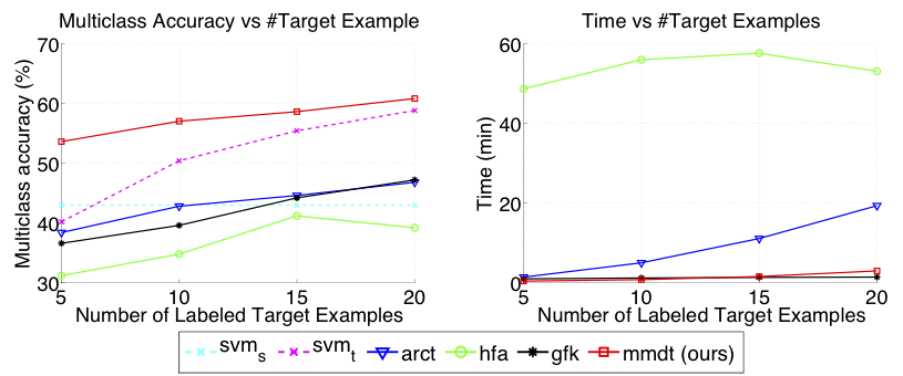 MMDT provides a way to adapt max-margin classifiers in a multi-class manner, by learning a shared component of the domain shift as captured by the feature transformation W . Additionally, MMDT can be optimized quickly in linear space, making it a feasible solution for problem settings with a large amount of training data. |