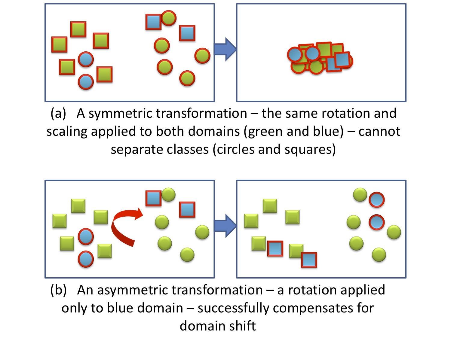 Domain transformations offer a flexible model for both supervised and unsupervised learning that allows us to transfer category independent information between domains. Previously, we show how to extend metric learning methods towards domain adaptation [1], allowing for learning metrics independent of the domain shift and the final classifier used. Understanding that not all domain shifts can be captured by a symmetric positive definite transform, we then extended this to learn a representation via an asymmetric, category independent transform [2]. Our framework can adapt features even when the target domain does not have any labeled examples for some categories, and when the target and source features have different dimensions. Data and Code available. |