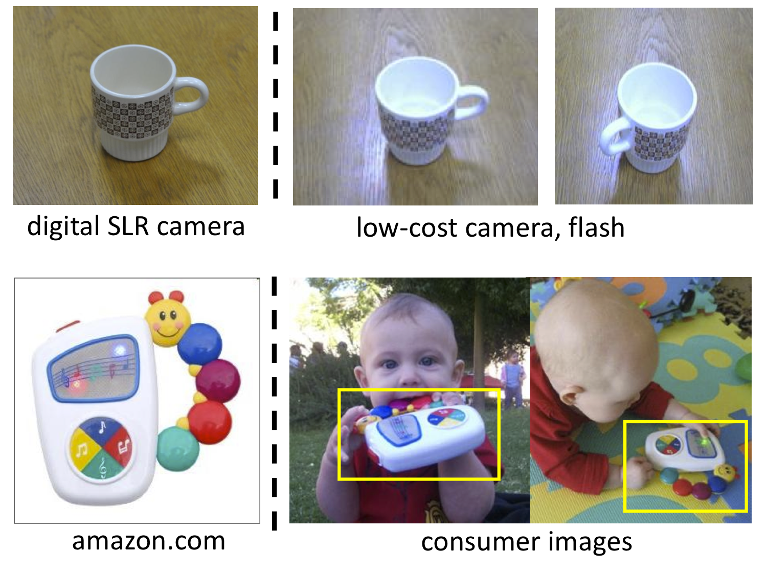 While the vast majority of object recognition methods today are trained and evaluated on the same image distribution, real world applications often present changing visual domains. In general, visual domains could differ in some combination of (often unknown) factors, including scene, intra-category variation, object location and pose, view angle, resolution, motion blur, scene illumination, background clutter, camera characteristics, etc. Recent studies have demonstrated a significant degradation in the performance of state-of-the-art image classifiers due to domain shift from pose changes (Farhadi and Tabrizi, 2008), a shift from commercial to consumer video (Duan et al, 2009, 2010), and, more generally, training datasets biased by the way in which they were collected (Torralba and Efros, 2011). |