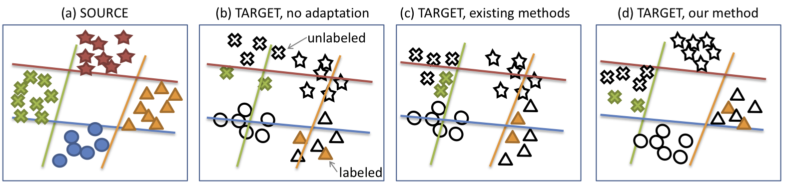 Max-margin Domain Transformations (MMDT) [5] is an algorithm which combines the representational power of our feature transformation methods with the robustness of a max-margin classifier. MMDT uses a transform W to map target features x to a new representation W x maximally aligned with the source, learning the transform jointly on all categories for which target labels are available (See figure below). |