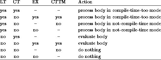 Successive forms are read from the file by the file compiler using read. These top-level forms are normally processed in what we call ``not-compile-time'' mode. There is one other mode, called ``compile-time-too'' mode, which can come into play for top-level forms. The eval-when special form is used to annotate a program in a way that allows the program doing the processing to select the appropriate mode.