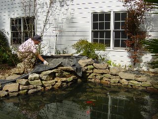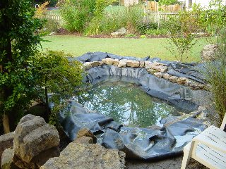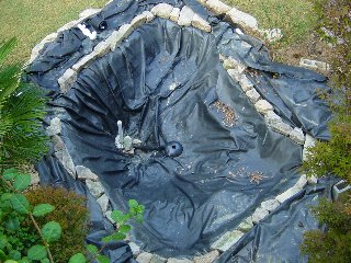 The next step is putting down the black pond liner. Actually, under