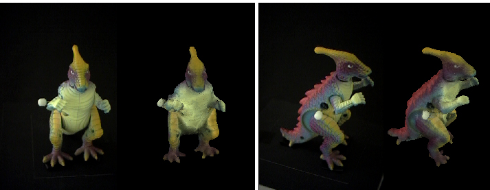 Comparisons of two photos of a dinosaur model with surface reconstructions using our method.
