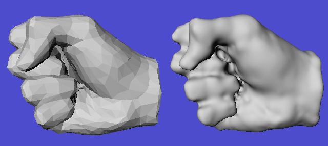 Polygonal fist (left) and resulting implicit surface (right).