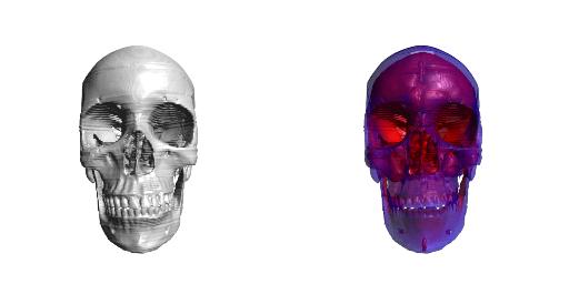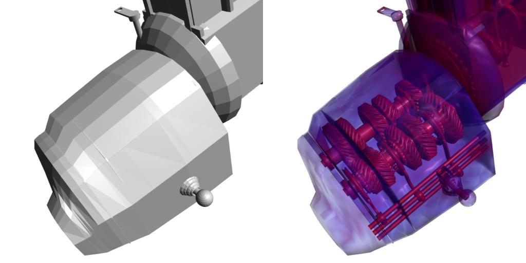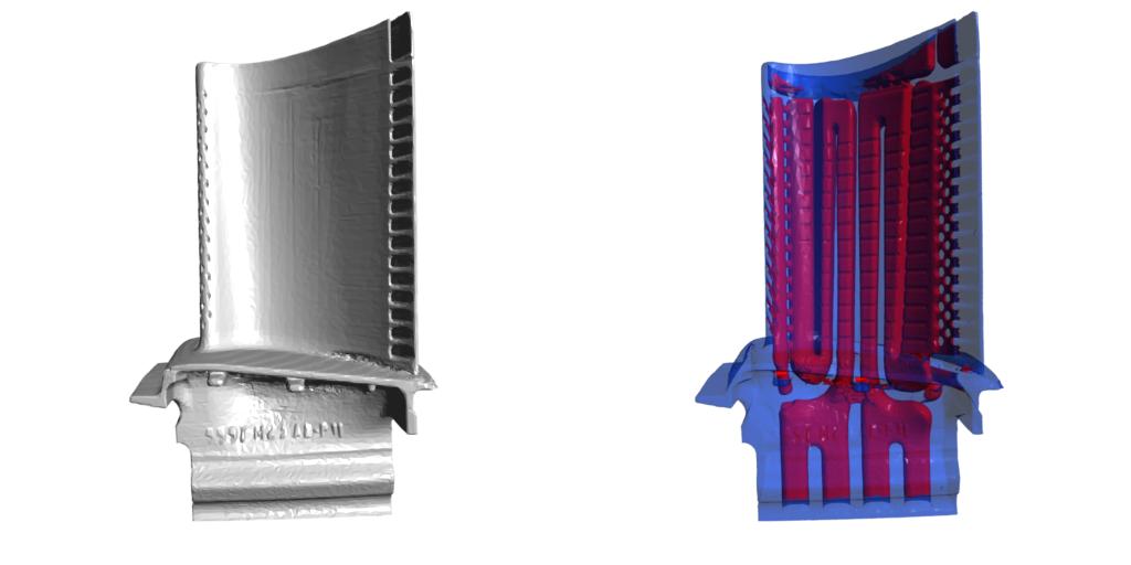 An engine turbine blade (left) and a rendering of the same model with the exterior surface made transparent (right).